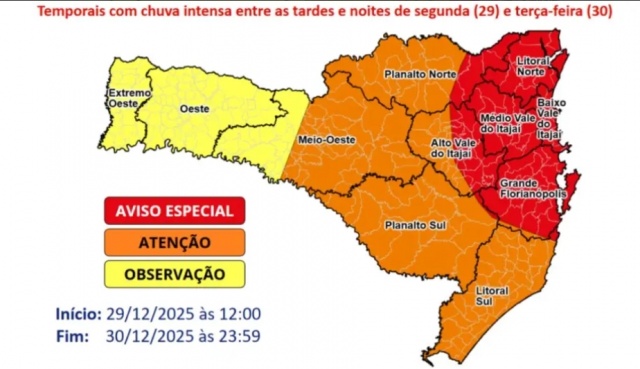 A Defesa Civil de Santa Catarina emitiu um alerta vermelho de “risco muito alto” para temporais a partir do meio-dia desta segunda (29) até a noite de terça-feira (30). O aviso inclui Grande Florianópolis, Litoral Norte, Vale do Itajaí, Alto Vale e Norte do Estado, além de partes da Serra e do Litoral Sul.