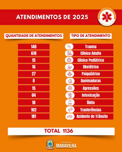Um relatório divulgado recentemente, demonstra que o Serviço de Atendimento Móvel de Urgência (SAMU) de Maravilha contabilizou 1136 atendimentos à população em 2025, ano em que o serviço completou 20 anos no município. Os tipos de atendimentos são variados, mas mais da metade se enquadra na categoria Clínico Adulto, que atingiu o total de 618 situações.