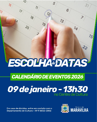 A Prefeitura de Maravilha informou que a Escolha de Datas do Calendário de Eventos 2026 está marcada para a próxima sexta-feira (9). O Departamento de Cultura convida entidades, grupos e organizadores para participar desta importante atividade, marcada para às 13h30 no Centro Municipal de Cultura Francisco Gialdi.