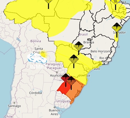 As chuvas devem ocorrer de forma mais generalizada, elevando o risco para alagamentos e enxurradas, além da possibilidade de ventos fortes e queda de granizo. As temperaturas seguem elevadas, superando os 30°C em todas as regiões, com picos de até 35°C no Litoral Norte e Litoral Sul.No domingo, dia 11, o tempo permanece quente e instável. Com o deslocamento gradual do ciclone em direção ao oceano, os temporais tendem a ganhar força no Litoral e áreas próximas, enquanto no Grande Oeste passam a ocorrer de forma mais isolada, devido à entrada progressiva de ar mais seco.