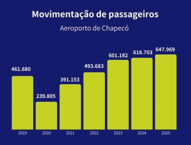 O Aeroporto de Chapecó – Serafim Enoss Bertaso, no Oeste de Santa Catarina, vem registrando recordes consecutivos de movimentação desde a conclusão do processo de ampliação e modernização do terminal. Ao longo de 2025, o aeroporto contabilizou quase 648 mil passageiros embarcados e desembarcados, alcançando a maior movimentação de sua história.