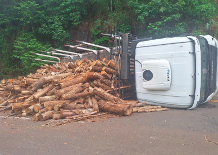 Para evitar um acidente de maiores proporções, o motorista optou por direcionar o veículo contra um paredão de pedras às margens da rodovia, o que ocasionou o tombamento. Com o impacto, parte da carga de madeira se espalhou pelo local.