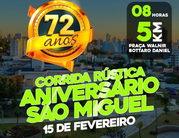 Estão abertas as inscrições para a Corrida Rústica em comemoração aos 72 anos de São Miguel do Oeste, que será realizada no dia 15 de fevereiro, com largada prevista para as 8h, na Praça Walnir Bottaro Daniel. A prova integra a programação oficial de aniversário do município.
