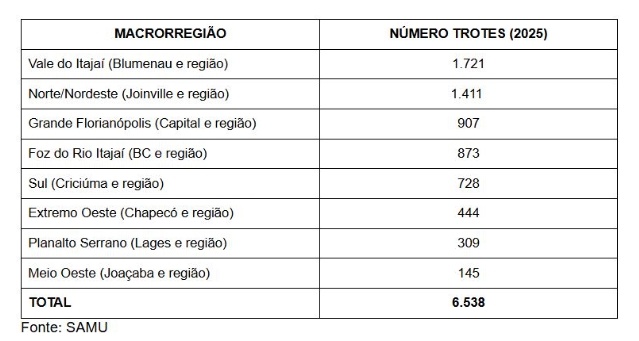 No total, o Estado contabilizou 6.538 trotes ao longo do ano, uma queda de 4,6% em relação a 2024, quando foram registradas 6.856 chamadas falsas. Embora o Vale do Itajaí lidere o ranking estadual, o volume de trotes no Oeste ainda preocupa, pois impacta diretamente a agilidade do atendimento a ocorrências reais de urgência e emergência.