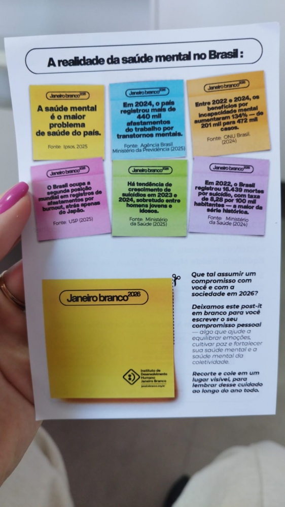 Neste sábado, dia 24, a campanha segue com a colagem de post-its em locais estratégicos, trazendo mensagens de conscientização. A proposta é ressignificar o uso do post-it, tradicionalmente associado a cobranças, prazos e pressões do cotidiano. No Janeiro Branco 2026, ele passa a simbolizar um alerta sobre a crise da saúde mental e um lembrete diário de que a mente também precisa de cuidado.