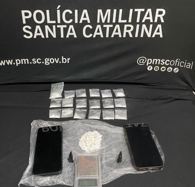 Diante das informações, a guarnição se deslocou até o endereço indicado. No local, a moradora autorizou a entrada dos policiais. Com o apoio de um cão de faro, foram encontradas mais porções de cocaína, totalizando cerca de 31 gramas, além de embalagens, uma balança de precisão e outros objetos utilizados para o tráfico de drogas.