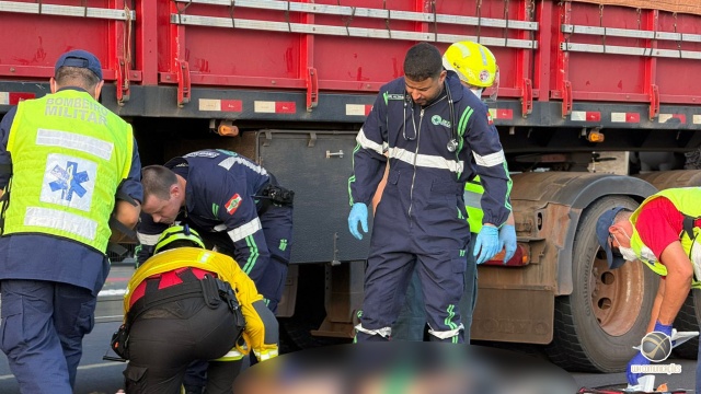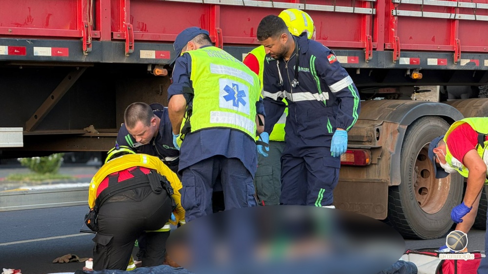 Equipes do Corpo de Bombeiros e do SAMU foram acionadas e prestaram atendimento no local. O motociclista estava consciente e orientado, mas apresentava ferimentos generalizados. A motocicleta ficou presa sob o rodado da carreta.