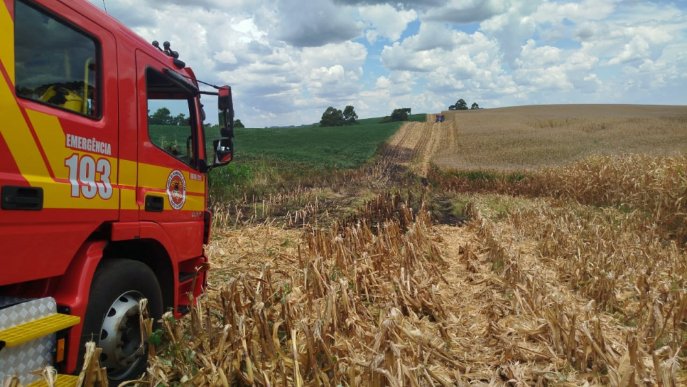 De acordo com informações repassadas pelo proprietário, o mesmo trabalhava na colheita do milho quando percebeu que o fogo teve início em uma área já colhida.