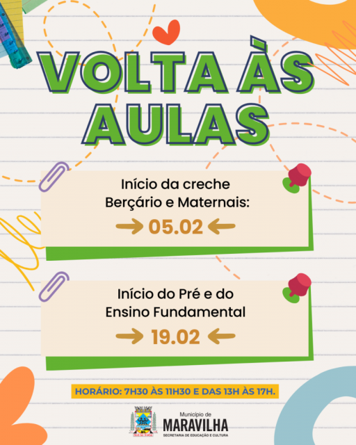 O Município de Maravilha, através da Secretaria de Educação e Cultura, informou que o ano letivo de 2026 iniciará oficialmente em fevereiro.