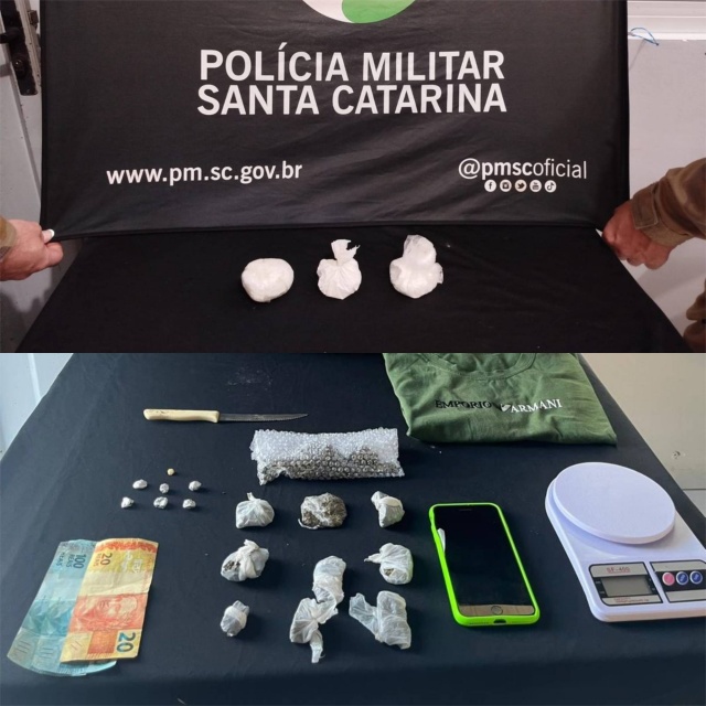 A primeira ocorrência foi registrada por volta das 14h, na Vila Basso. Durante patrulhamento de rotina, os policiais abordaram um homem de 20 anos, que estava próximo a uma área de mata. Na revista pessoal, foram encontradas seis porções de maconha, totalizando 33 gramas, e sete pedras de crack, somando quatro gramas, além de uma balança de precisão, uma faca usada para fracionar a droga e R$ 220 em dinheiro.