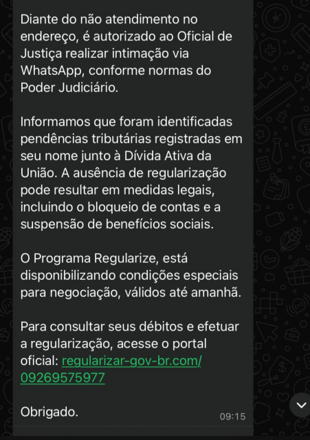 No exemplo enviado por um ouvinte, os golpista entra em contato pelo WhatsApp se passando por um oficial de justiça, informando que tentou entregar uma intimação presencialmente, mas não conseguiu. Em seguida, avisa que foram identificadas pendências tributárias em nome do destinatário junto à Dívida Ativa da União, alegando que a falta de regularização pode resultar em medidas legais, como o bloqueio de contas. Na sequência, enviam um link fraudulento, alegando se tratar de um canal oficial do Governo.