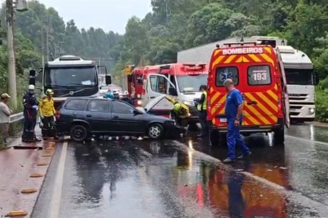 Conforme as informações apuradas no local, um dos caminhões aquaplanou devido à pista molhada. Na sequência, o Corsa acabou colidindo com o outro caminhão que trafegava pelo trecho.