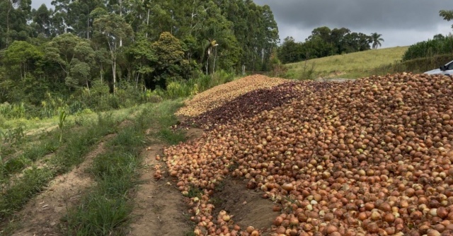 Montanhas de cebolas foram descartadas à beira de uma rodovia em Aurora, no Alto Vale do Itajaí, em mais um retrato da crise que atinge a principal cadeia produtiva da região. Pelo menos 11 grandes montes do produto chamaram a atenção de quem passou pelo local e evidenciam o colapso nos preços, atualmente abaixo do custo de produção.