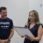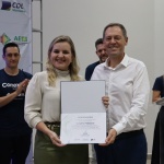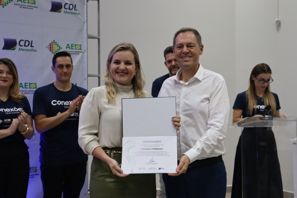 Durante a cerimônia, a ex-presidente da CDL e Associação Empresarial de Maravilha, Caroline Maldaner, recebeu um Certificado de Agradecimento concedido pela FCDL, em reconhecimento à sua dedicação e contribuição ao fortalecimento das entidades.