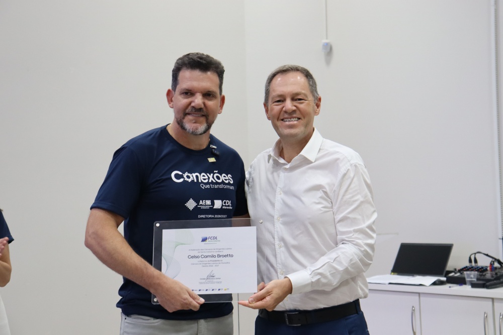 A vice-presidente regional da FACISC, Vanessa Back Bertol, realizou a colocação do Pin do Associativismo no presidente empossado da CDL e Associação Empresarial de Maravilha, Celso Camilo Broetto, além da entrega do Certificado de Posse. Na sequência, o vice-presidente de Patrimônio da FCDL, Aliceo Vacarin, realizou a colocação do Pin da FCDL e também entregou o Certificado de Posse ao novo presidente da entidade.