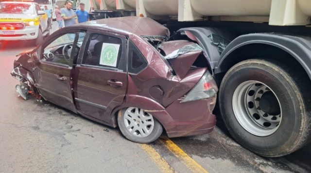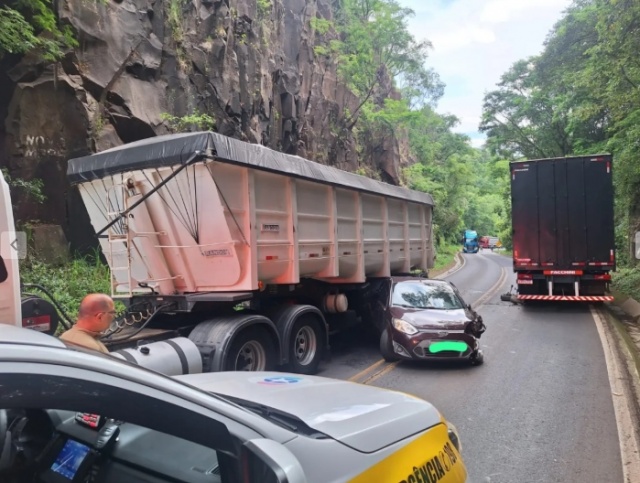De acordo com a Polícia Militar Rodoviária (PMRv), a colisão lateral envolveu um automóvel e dois caminhões. No total, três pessoas saíram ilesas. Ainda conforme a corporação, o acidente aconteceu em um trecho asfaltado, de pista simples, com duas faixas de rolamento, sem acostamento, em uma curva aberta em aclive.