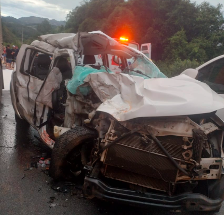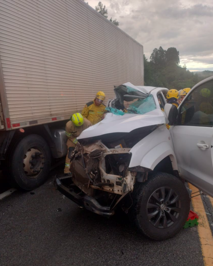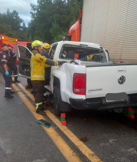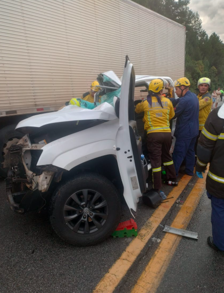 A colisão envolveu uma caminhonete Amarok e um caminhão e mobilizou equipes do Corpo de Bombeiros Militar de Santa Catarina, do Samu e da Polícia Rodoviária Federal.
