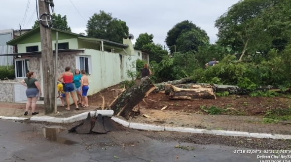 Conforme a Defesa Civil municipal, além da obstrução de ruas, houve danos na rede elétrica, deixando diversos pontos sem fornecimento de energia. Imagens compartilhadas nas redes sociais mostram prejuízos em residências e veículos. O Corpo de Bombeiros Militar de Santa Catarina atua na retirada de árvores e liberação das vias, com apoio da Defesa Civil. Apesar dos danos materiais, não houve registro de vítimas.