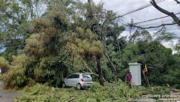 Rajadas de vento e chuva intensa provocaram estragos em municípios do Oeste catarinense na tarde e noite desta quinta-feira (19). Em Itá, o temporal atingiu a cidade por volta das 17h, causando a queda de árvores de grande porte, postes e fiação elétrica, principalmente na área central.