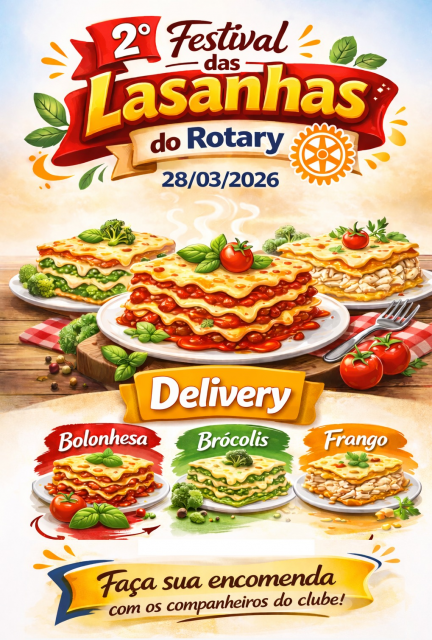 Estão sendo disponibilizadas três opções de lasanha para encomenda: bolonhesa, brócolis e frango. As fichas podem ser adquiridas junto aos companheiros do clube. A entrega está marcada para o dia 28 de março, na sede do Rotary, entre às 9h e às 13h.