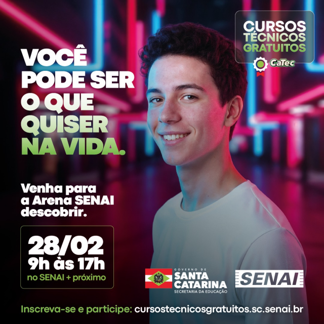 O SENAI/SC promove neste sábado (28) o Arena SENAI, um dia especial de portas abertas para apresentar 14,7 mil vagas em 32 cursos técnicos gratuitos a jovens do ensino médio da rede estadual. Os cursos são oferecidos gratuitamente através do CaTec, um programa da Secretaria de Estado da Educação (SED) direcionado a estudantes do 1º e do 2º ano do ensino médio da rede estadual.