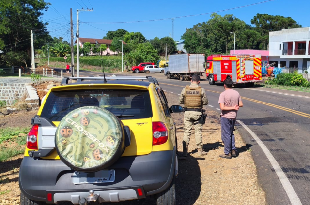 O Corpo de Bombeiros Militar de Palmitos foi acionado na manhã desta sexta-feira (27), por volta das 09h36, para atendimento a um acidente de trânsito envolvendo uma colisão fronto-lateral entre um carro e um caminhão no Distrito de Santa Lúcia. A ocorrência foi registrada na Rodovia Claumir Luiz Treviso.