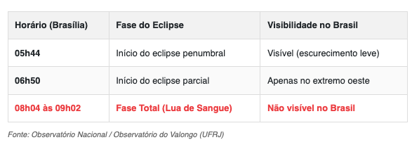 O fenômeno da Lua de Sangue — quando o satélite ganha um tom avermelhado — será visível apenas parcialmente em alguns estados do Norte, como Acre, Rondônia e o oeste do Amazonas. Para o restante do país, a experiência será bem mais discreta.