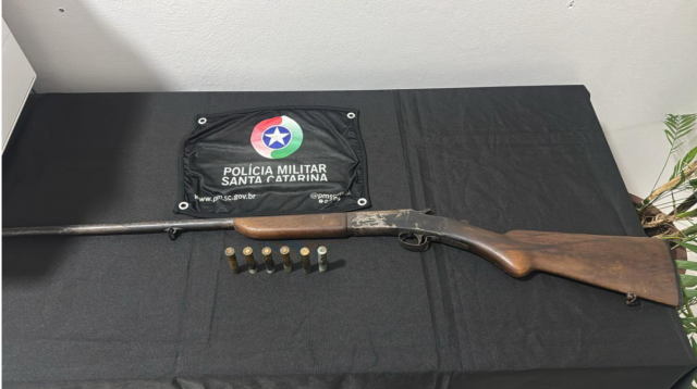 Espingarda calibre 36 sem registro foi localizada em residência. Foto: Divulgação/PMSC