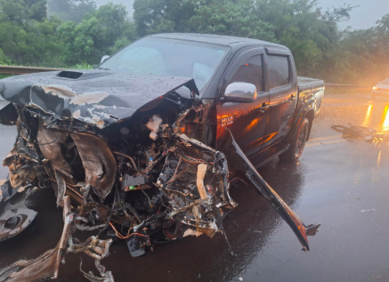 Uma caminhonete Toyota Hilux ficou completamente destruída após se envolver em um acidente com um caminhão no início da noite desta segunda-feira (9), na rodovia SC-157, em Novo Horizonte, no Extremo-Oeste de Santa Catarina.