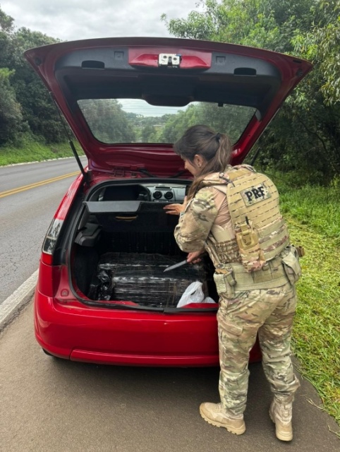 Durante a abordagem a um veículo Ford Fiesta com placas de Laranjeiras do Sul, os policiais localizaram um fardo da droga envolto em plástico preto atrás do banco do motorista.