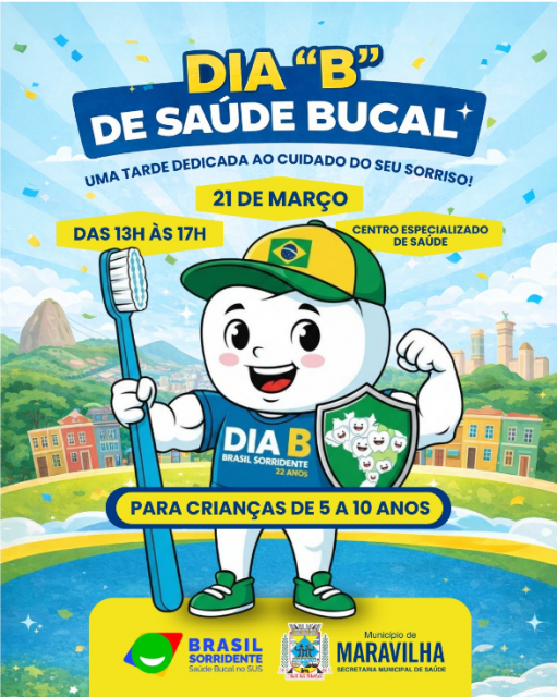 O DIA “B” DE SAÚDE BUCAL já tem data para ocorrer em Maravilha: na tarde de 21 de março, com uma programação que prevê ações direcionadas às crianças, evidenciando a importância de incentivar o cuidado com o sorriso desde a infância. As atividades terão início às 13h, no Centro Especializado em Saúde.