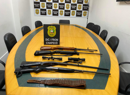 Durante o cumprimento das ordens judiciais nesta quarta-feira, os policiais localizaram na casa do pai da suspeita duas espingardas de calibre 36, duas espingardas de pressão com indícios de adulteração para calibre 22 e 15 munições de calibre 36.