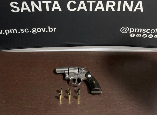 Durante as diligências, os policiais foram até a residência do suspeito, onde encontraram um revólver calibre .32 com seis munições deflagradas.