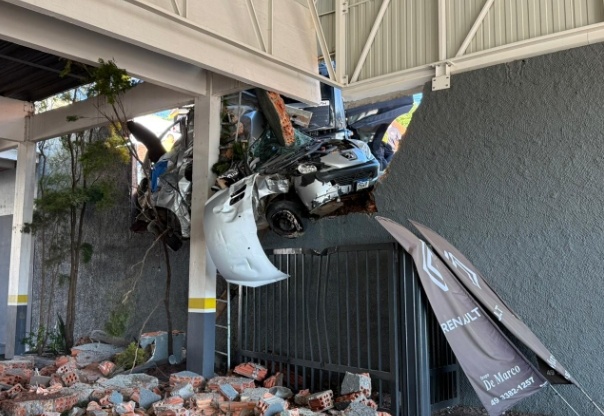 No momento da colisão, o carro não estava ocupado. Com o impacto, o veículo foi lançado contra a estrutura de uma oficina mecânica, derrubando parte do muro e ficando preso, escorado por um pilar.