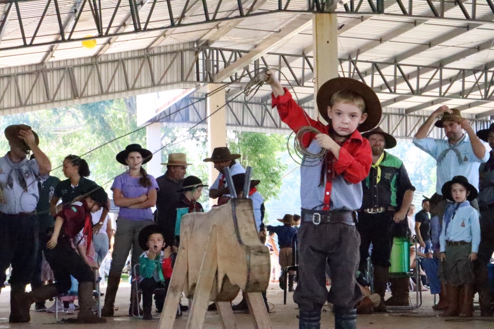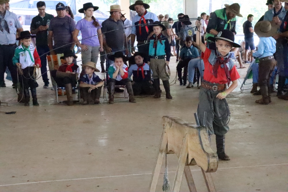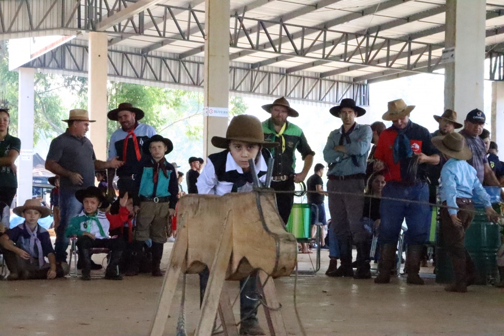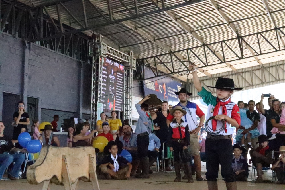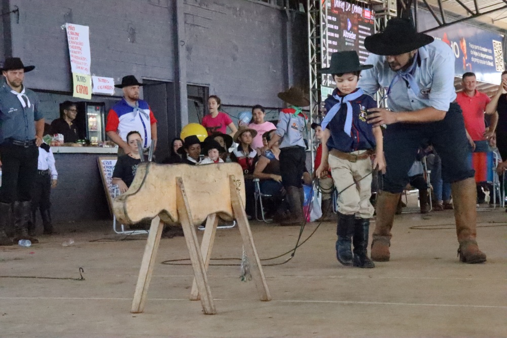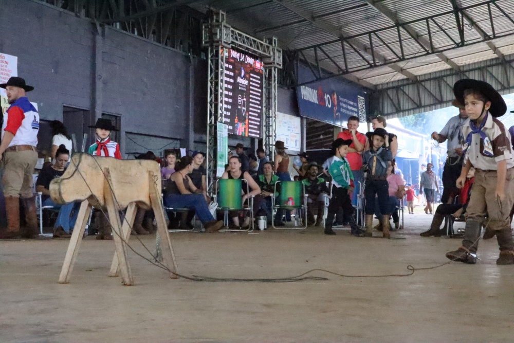 Entre as provas campeiras, hoje ocorreu a “vaca parada”, voltada às crianças. Meninos e meninas de diferentes idades tiveram a oportunidade de demonstrar habilidade ao laçar o boi de madeira. A prova ocorreu na parte superior da arquibancada coberta, reunindo famílias, e a narração de cada armada.