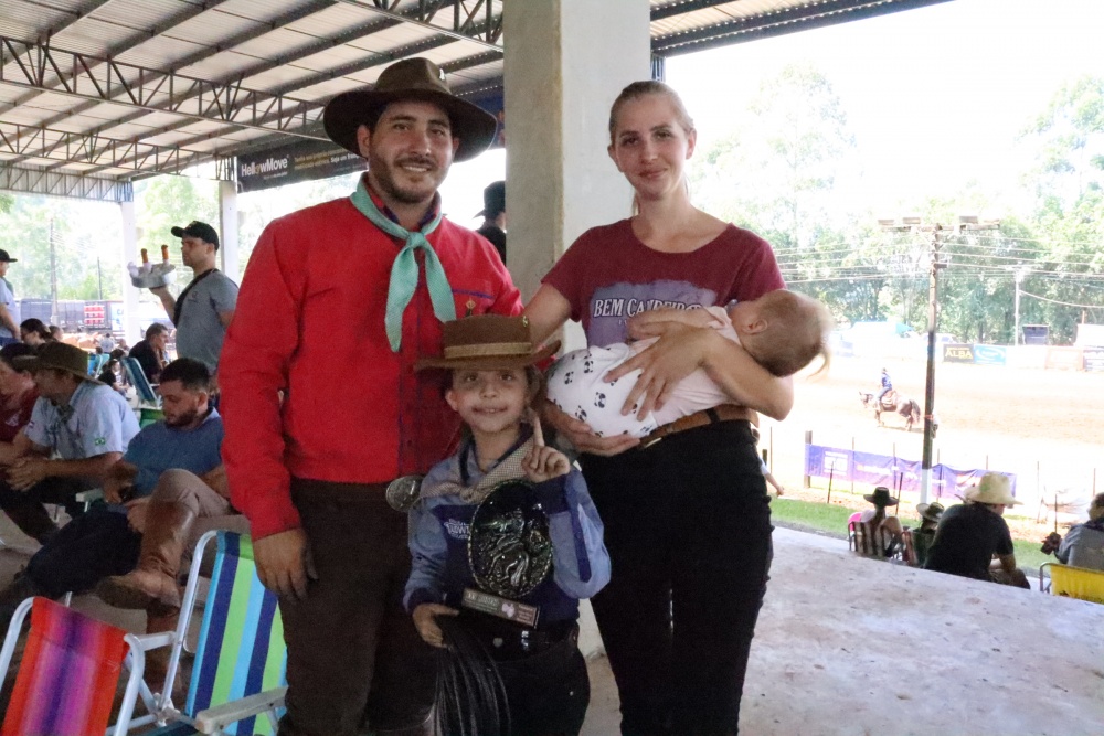 Brenda Ludwig Aguiar, de 6 anos, com seu laço na mão, foi uma das participantes. Filha de Rafael e Raquel Aguiar, do CTG Recanto da Tradição, a família veio de São Bernardino para participar do evento - sendo esta a primeira vez no rodeio em Maravilha. Os pais destacaram o incentivo à filha, motivado pela paixão pelo tradicionalismo e pelos momentos de união proporcionados por esse tipo de evento. Ao acertar sua última armada, Brenda conquistou o título da categoria “menininha”, de 5 a 7 anos. Emocionada, correu para abraçar os pais e a irmã bebê, Mayra, comemorando a vitória. A mãe ressaltou a emoção ao ver a felicidade da filha já com o troféu em mãos.