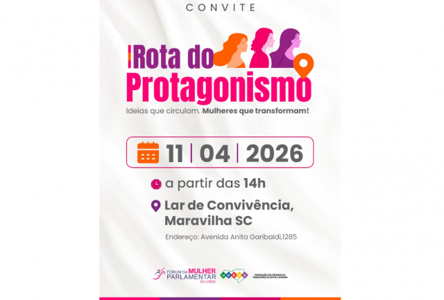 A Federação das Câmaras Municipais de Santa Catarina (Uvesc), por meio do Fórum da Mulher Parlamentar, promove no dia 11 de abril, em Maravilha, o primeiro encontro do movimento “Rota do Protagonismo, Ideias que Circulam, Mulheres que Transformam”. O evento acontece a partir das 14h, no Lar de Convivência Maravilha.