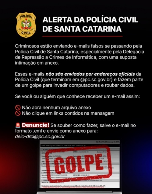 A Polícia Civil de Santa Catarina emitiu um alerta sobre um golpe que está sendo aplicado por meio de e-mails falsos enviados à população. Segundo a corporação, criminosos estão se passando pela instituição, especialmente pela Delegacia de Repressão a Crimes de Informática, para enganar vítimas.
