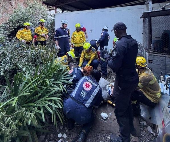 Durante o atendimento, a vítima relatou estar com o braço e a perna do lado esquerdo presos, o que exigiu um trabalho técnico e cuidadoso das equipes para acesso e retirada.