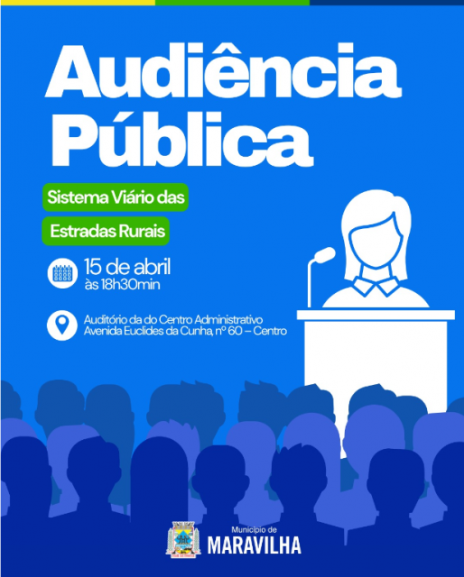 A Administração Municipal convida toda a população de Maravilha para participar da Audiência Pública que será realizada no dia 15 de abril, às 18h30, na Sala de Reuniões do Centro Administrativo Municipal. O encontro tem por objetivo apresentar o teor do Projeto de Lei que regulamenta o sistema viário das estradas rurais, especialmente quanto: