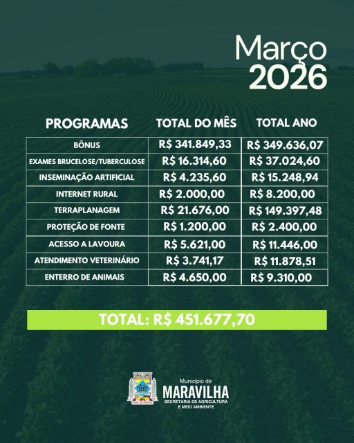 A Secretaria de Agricultura e Meio Ambiente de Maravilha divulgou o balanço dos valores repassados aos agricultores do município, por meio dos Programas Municipais de Incentivo à Agricultura, durante o mês de março. No período, foram investidos R$ 401.287,70 em diversas ações.