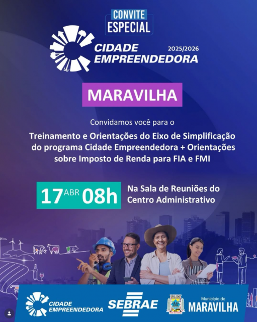 O Município de Maravilha, através da Sala do Empreendedor, em parceria com o Sebrae, realiza no próximo dia 17 de abril, às 8h, um treinamento voltado ao eixo de simplificação do programa Cidade Empreendedora, além de orientações sobre destinação do Imposto de Renda para o Fundo da Infância e Adolescência (FIA) e Fundo Municipal do Idoso (FMI).