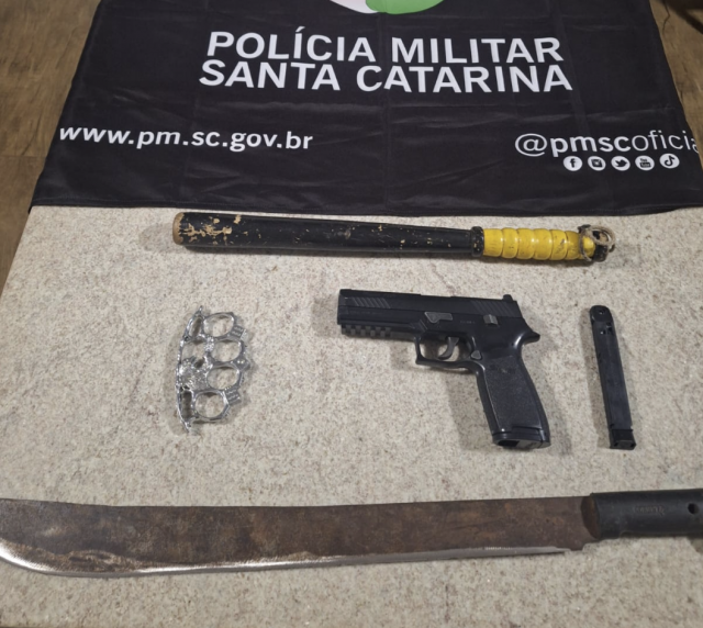 Na abordagem, os ocupantes foram identificados como os suspeitos da ocorrência. Em revista pessoal nada de ilícito foi encontrado, porém, durante buscas no veículo, foram localizados um simulacro de arma de fogo tipo pistola (modelo P320) no porta-luvas, um facão ao lado do banco do motorista, além de um soco inglês e um bastão de madeira atrás do banco do passageiro.