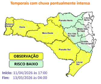 No litoral, a circulação marítima ganha força nas noites e madrugadas, especialmente entre a Grande Florianópolis, Baixo e Médio Vale do Itajaí e Litoral Norte. Nestas áreas, o risco é maior para alagamentos e enxurradas pontuais.