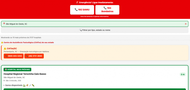 Uma plataforma online foi criada para auxiliar a população na localização de hospitais que possuem soro contra venenos de animais peçonhentos em todo o Brasil. O site Soro Já reúne dados oficiais do Ministério da Saúde e utiliza a localização do usuário para indicar os pontos de atendimento mais próximos.