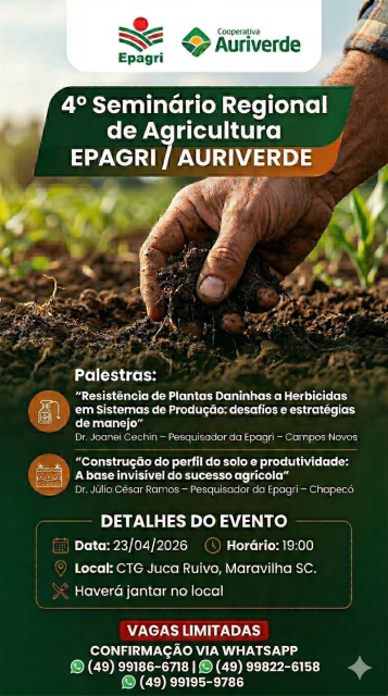 Nesta quinta-feira (23), Maravilha recebe o 4º Seminário Regional de Agricultura da EPAGRI e AURIVERDE. O evento será realizado a partir das 19h no CTG Juca Ruivo, e contará com duas palestras ministradas por pesquisadores da Epagri: