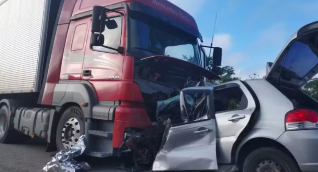 O condutor da carreta relatou aos policiais que o carro invadiu a contramão, o que teria provocado a colisão frontal.
