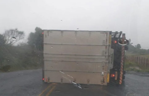 Em Cruz Alta, no noroeste gaúcho, um caminhão tombou pela força do vento nesta quinta-feira (23). O Corpo de Bombeiros e a Defesa Civil atenderam a ocorrência por volta das 11h, na RS-481, trecho que liga o município a Salto do Jacuí.