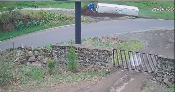 Imagens de uma câmera de segurança registraram o momento exato em que uma carreta sem freios tombou às margens da BR-282, no interior de Descanso, no trecho entre São Miguel do Oeste e Maravilha, na tarde deste sábado (25).