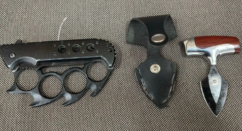 Com ele, foram apreendidos uma faca e um canivete com soco inglês. O homem foi preso em flagrante e encaminhado à Delegacia de Polícia Civil.